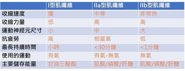 另外,白肌纖維(II型肌纖維)又可分為IIa型、IIb型與IIc型三種,其主要的特性都在下列表內。對於I型肌纖維來說它的收縮速度較慢、有氧能力與抗疲勞性較高,因此較適合長時間的耐力型運動,IIb型肌纖維抗疲勞性低再加上持續時間短,因此適合短時間的爆發力訓練動作,IIa型肌纖維則是具備I型肌纖維與IIb型肌纖維的特性。