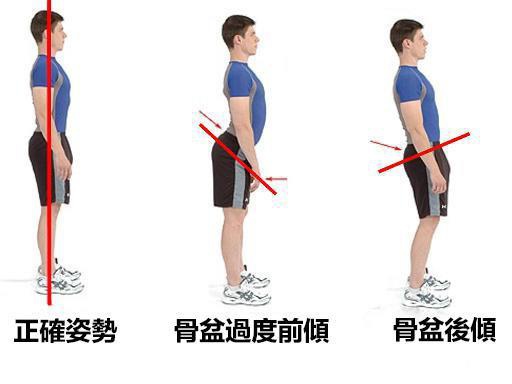 骨盆狀態中最需要注意的就是前後左右的傾斜度,前後傾斜度的指標為骨盆傾斜角度(pelvic inclination),為於骨盆前端隆起處的髂前上棘(可卡住褲頭的突起部分)及後端的髂後上棘連線與水平線所形成的角度及為骨盆傾斜角度,若此前傾角度太大,使骨盆往前被推擠而出時,脊椎的S型彎曲程度就會變得更大,相反的,若後傾程度大於標準值,脊椎的彎曲程度就會變的較於不明顯。